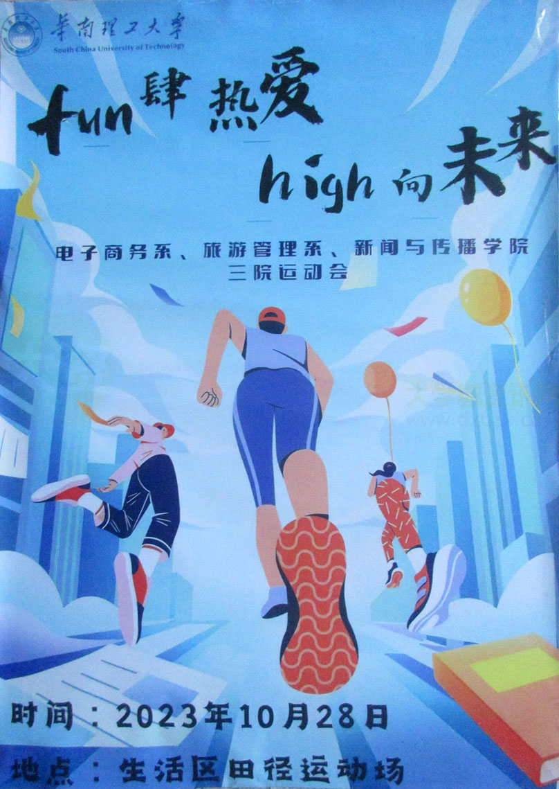 华工-电子商务系 旅游管理系 新闻与传播学院 三院系联合运动会 举行时间2023年10月28日 上午&下午 生活区运动场 |