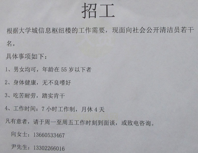 大学城信息枢纽楼招聘清洁工若干名 男女不限 7小时工作制 月休4天 联系13660533467向女士 |