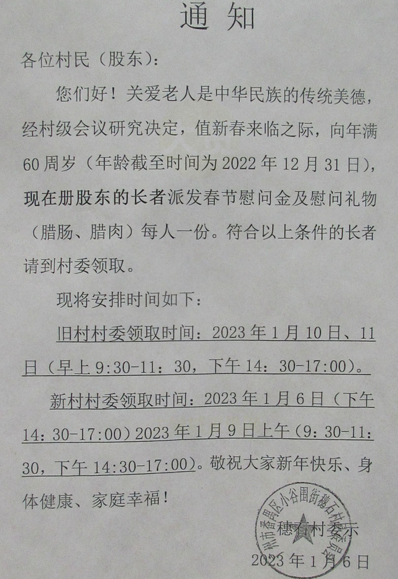 | 新年春节 穗石村60周岁以上长者派发慰问金及礼物通知 领取时间1月10号、11号 谷围新村1月6号、9号 穗石村委示2023.01.06 | ||||||