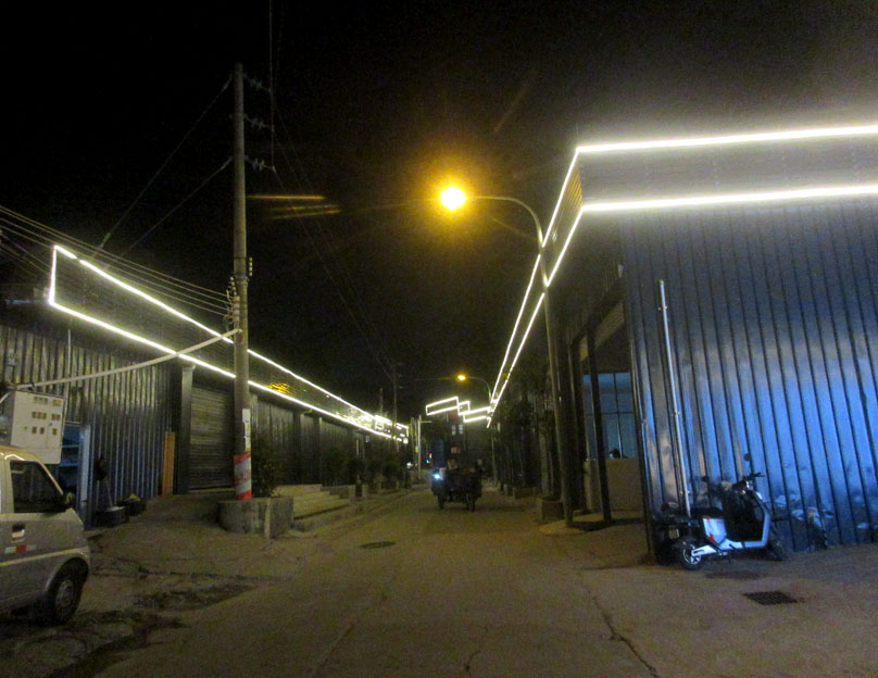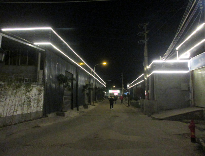 穗石村直街大街中西段棚户仓库房外加铁皮加固升级改造后 最近看到还增安装了晚上灯光缀饰 夜晚看起来还挺有几分存在感,远看的话不知道的还以为是什么高级服务会所或娱乐场or园区呢,周边道路也变得比之前要光亮了很多
