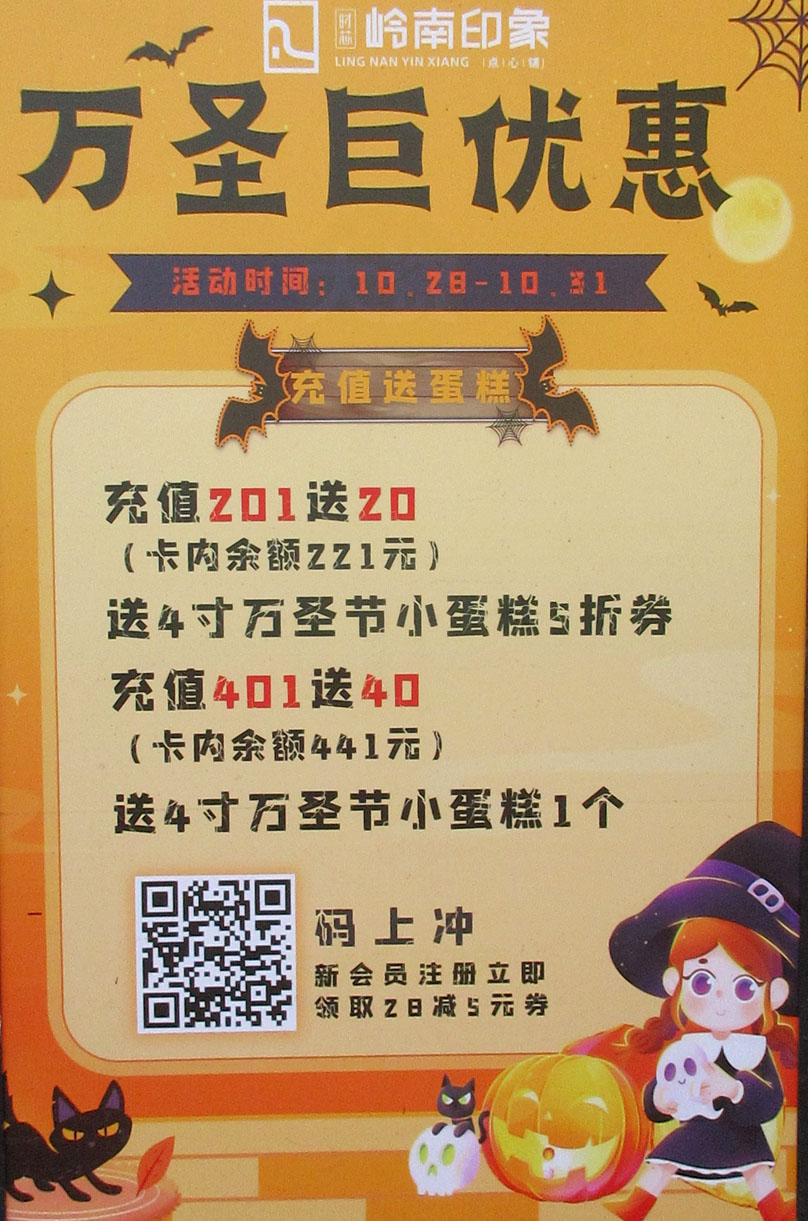 | 穗石大道&大利家正门旁 岭南印象蛋糕面包店 万圣节巨优惠 活动时间:10.28-10.31 充值送蛋糕 | ||||||