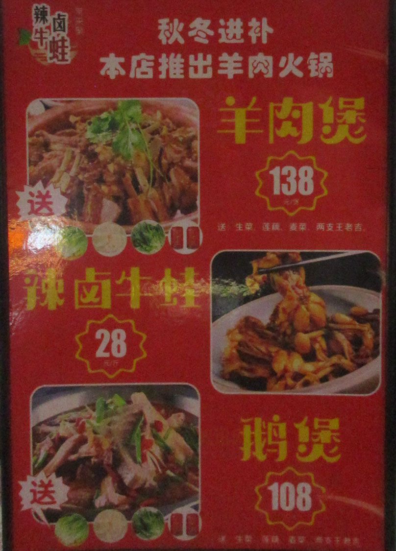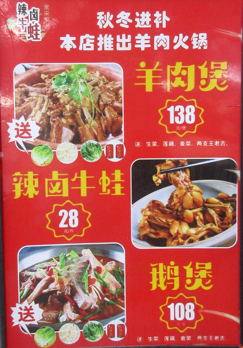 穗石大利家超市南外列东 常来聚 辣卤牛蛙28元1斤 推出秋冬进补羊肉火锅 羊肉煲138元/鹅煲108元,均送生菜、莲藕、麦菜、两支王老吉