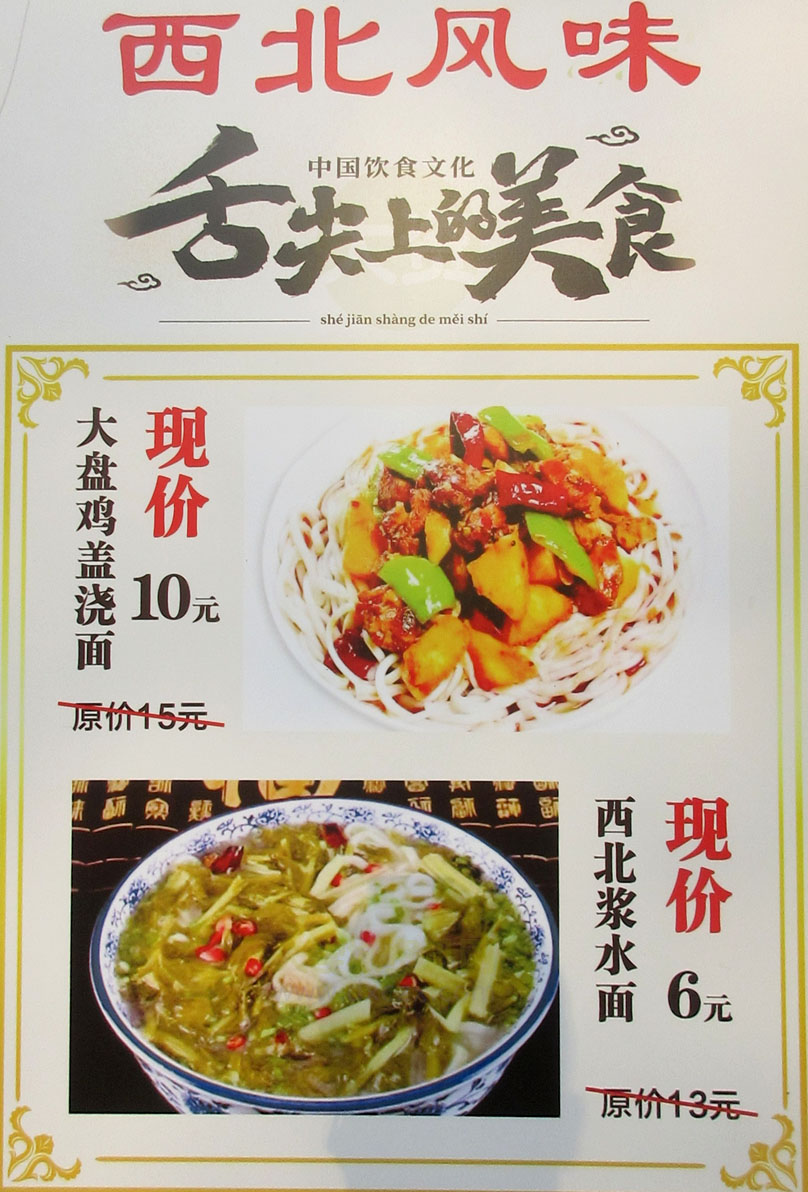 | 中大四饭-西北风味&舌尖上的美食 特价供应 大盘鸡盖浇面原价15元现价10元 西北浆水面原价13元现价6元 | ||||||