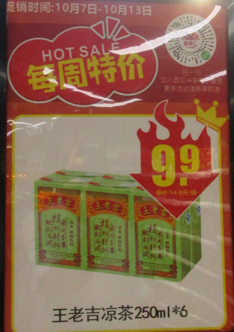 西亚兴安超市 每周特价 纸盒6瓶装王老吉只需9.9元 原价14.8元 促销时间 10.7-10.13