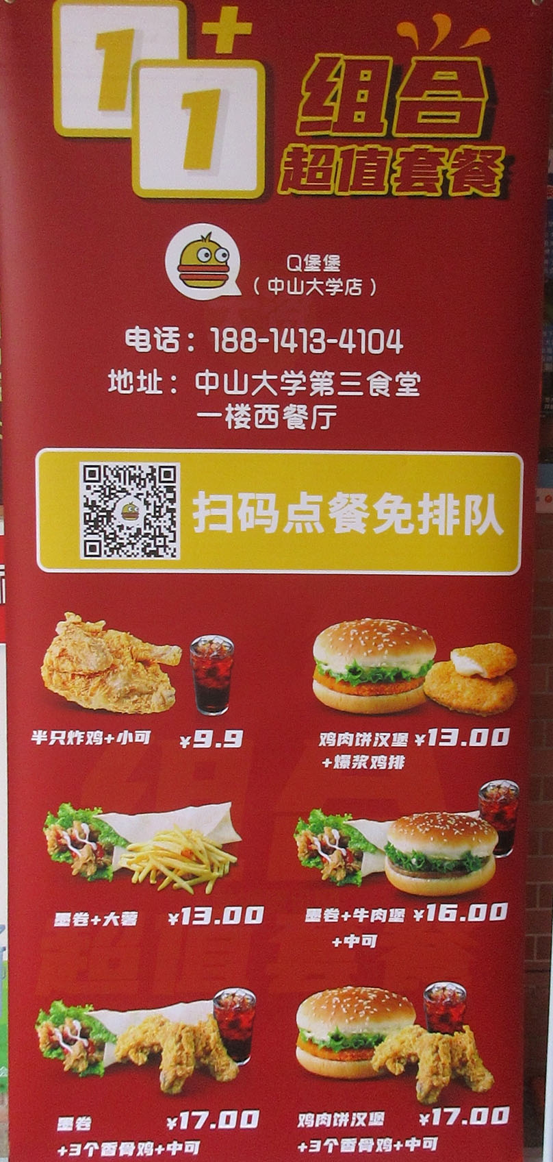 | 中大三饭东北角 一楼西餐厅 Q堡堡 1+1组合超值套餐推荐 扫码点餐免排队 | ||||||
