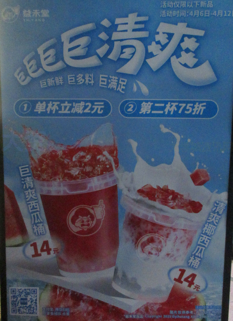 | 中大生活区至善园4栋一楼北西侧 益禾堂 新品-巨清爽西瓜桶14元、清爽椰西瓜桶14元,4月6日-12日,以上新品单杯立减2元,第二杯7.5折 | ||||||