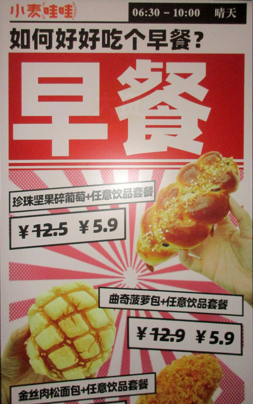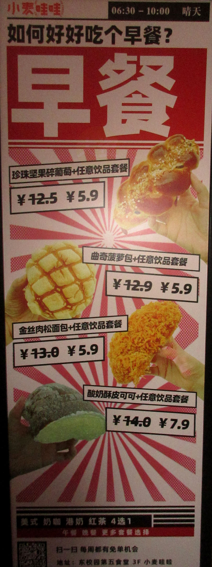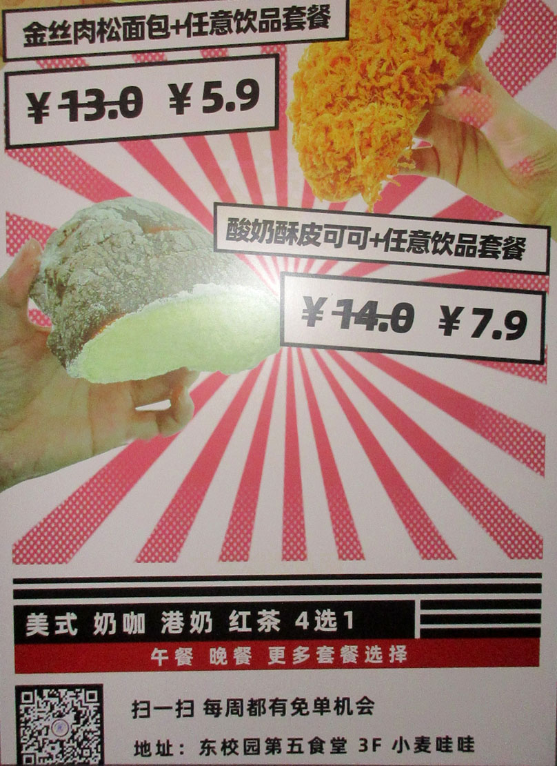 中大五饭(三楼)西门出入口北侧 小麦哇哇 如何好好吃个早餐? 珍珠坚果碎葡萄+任意饮品套餐5.9元(原价12.5),曲奇菠萝包+任意饮品套餐5.9元(原价12.9),金丝肉松面包+任意饮品套餐5.9元(原价13),酸奶酥皮可可+任意饮品套餐7.9元(原价14) 扫一扫每周都有免单机会