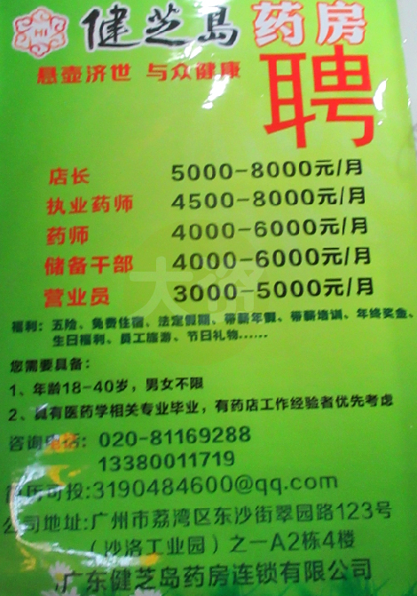 南亭健芝岛药房聘店长、执业药师、药师、储备干部、营业员