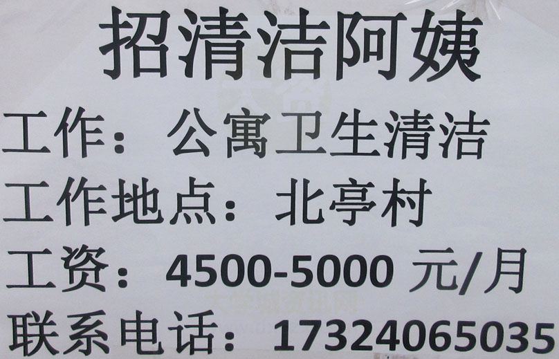 北亭村某公寓招聘卫生清洁阿姨 工资4500-5000元每月 电话17324065035