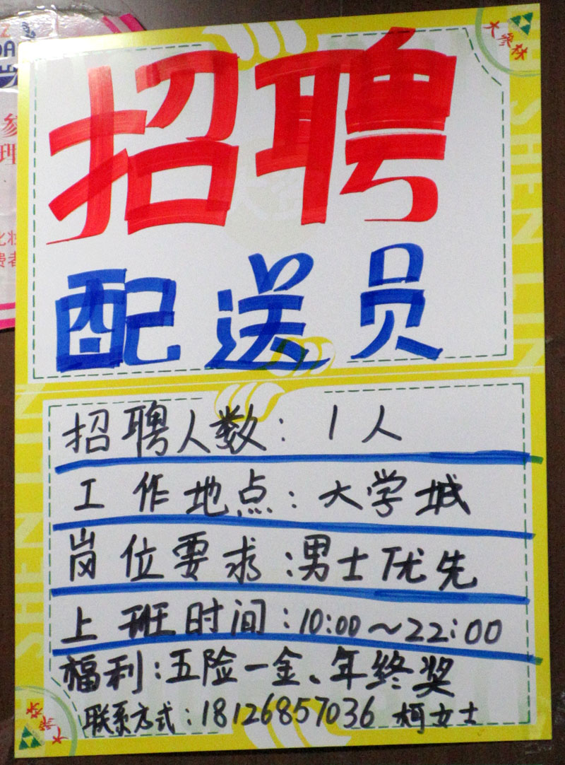 南亭大参林药店-招聘配送员1名 男士优先 工作范围大学城 上班时间10:00-22:00