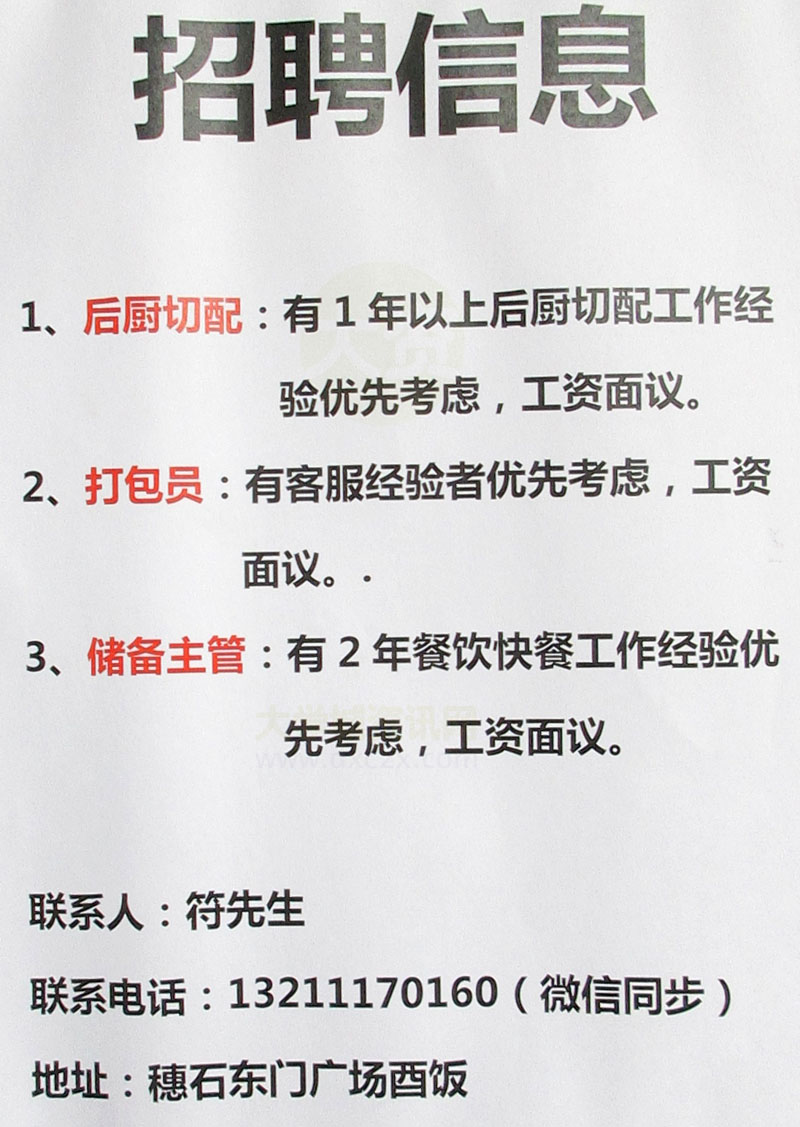 穗石村东门广场T7栋南-酉饭-招聘后厨切配、打包员、储备主管