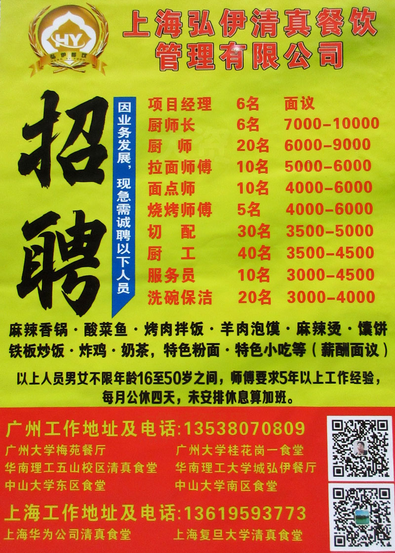 上海弘伊清真餐饮管理有限公司(广大梅苑餐厅、中大饭堂、华工饭堂)招聘