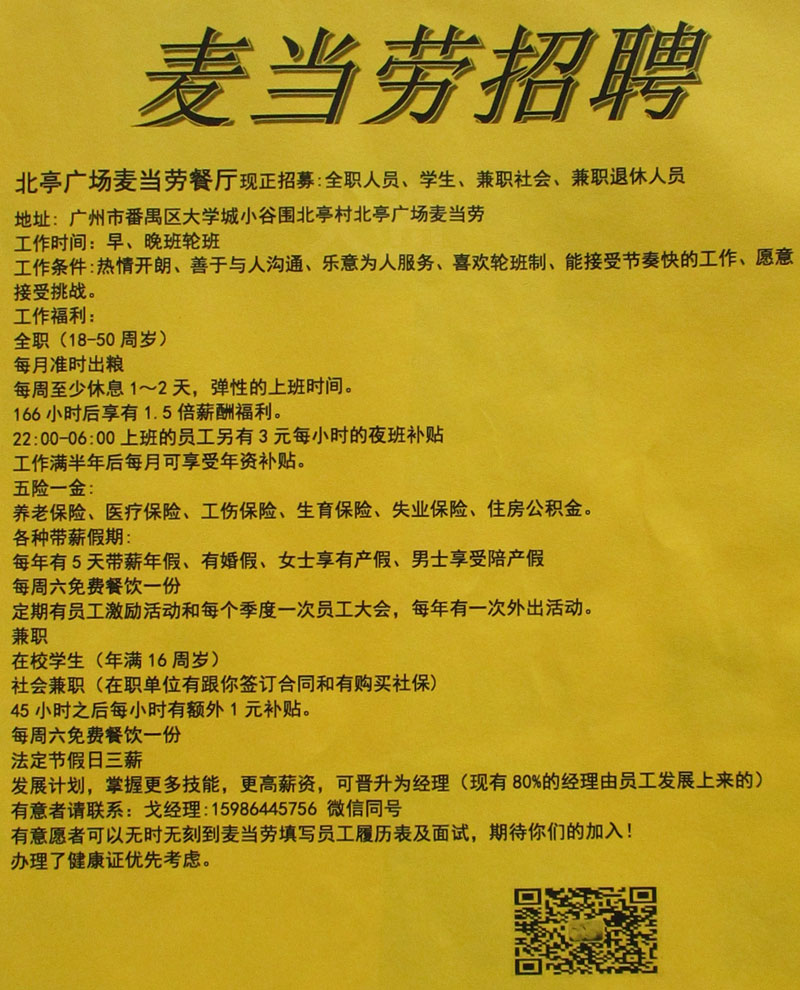 北亭广场麦当劳餐厅招聘现正招募:全职人员、学生、兼职社会、兼职退休人员