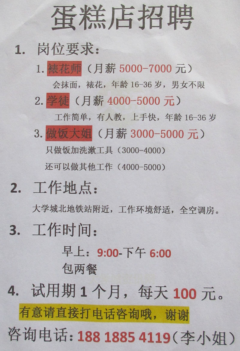 城北地铁站附近蛋糕店招聘裱花师、学徒、做饭大姐