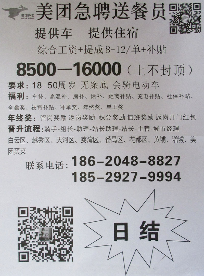 美团急聘送餐员 提供车 提供住宿 薪资8500--16000