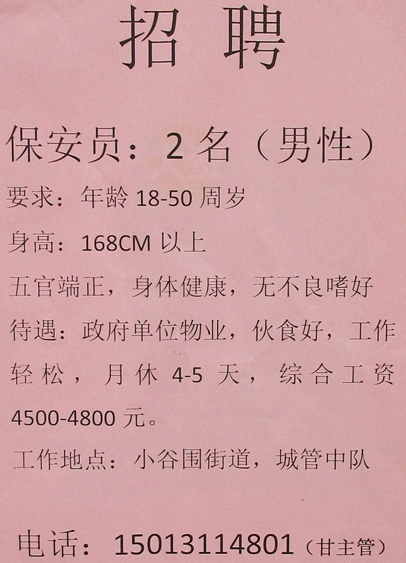 小谷围街道城管中队招聘保安员2名 年龄18-50岁 身高168CM以上 工资4500-4800元